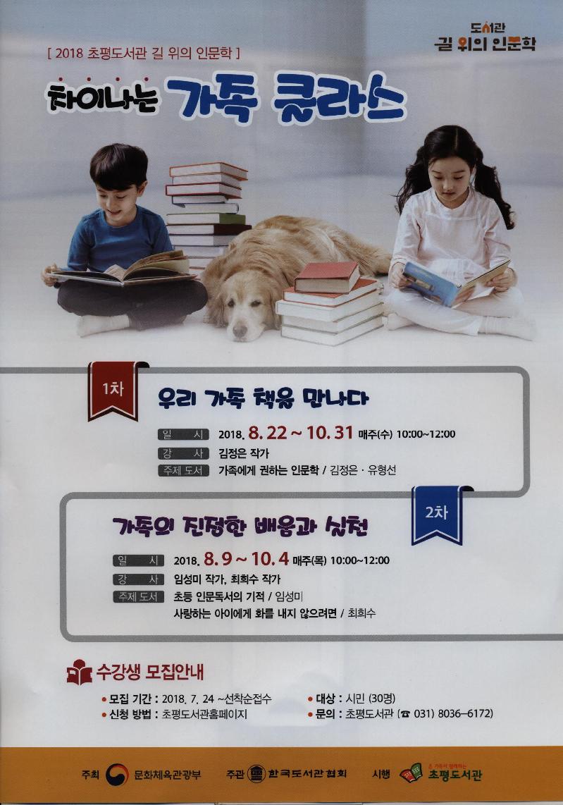 초평도서관에서는 ‘차이나는 가족 클라스’라는 타이틀로 참여자 중심의 독서 활동인 ‘함께 읽기’프로그램을 운영하며, 다양한 가족의 모습과 생활 이야기로 가족의 가치 재발견과 가족 사랑에 대한 공감대를 형성하고, 현대사회의 가족생활 변화에 따른 다양한 변화와 위기를 인문학적 관점으로 풀어가는 기회를 제공할 예정이다.