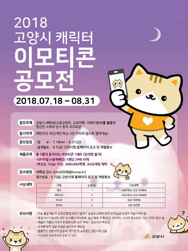 이번 공모전은 고양고양이, 고야가족, 가와지볍씨 등 고양시 캐릭터를 활용한 순수 창작 이모티콘을 주제로 유머와 재치가 돋보이는 참신한 이모티콘 디자인을 대상으로 한다.
