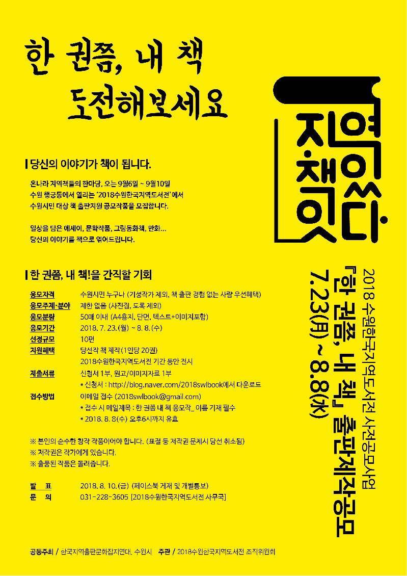 ‘한 권쯤, 내 책’ 출판 지원 공모는 지역출판 콘텐츠를 발굴하기 위해 일반 수원시민을 대상으로 개인의 책을 제작해준다. 일상이야기, 그림동화 책등 자유 형식이나 사진집과 도록은 제외한다.