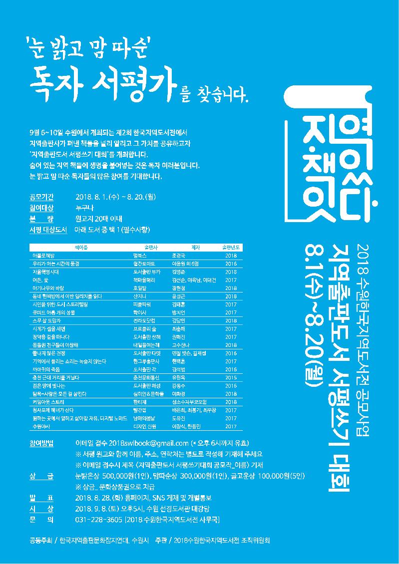 이와 함께 지역출판도서 서평 쓰기 공모도 진행된다. 한국지역출판문화잡지연대의 추천을 받아 선정된 22권의 도서 중 한 권을 선택해 서평을 써 공모하면 된다.
