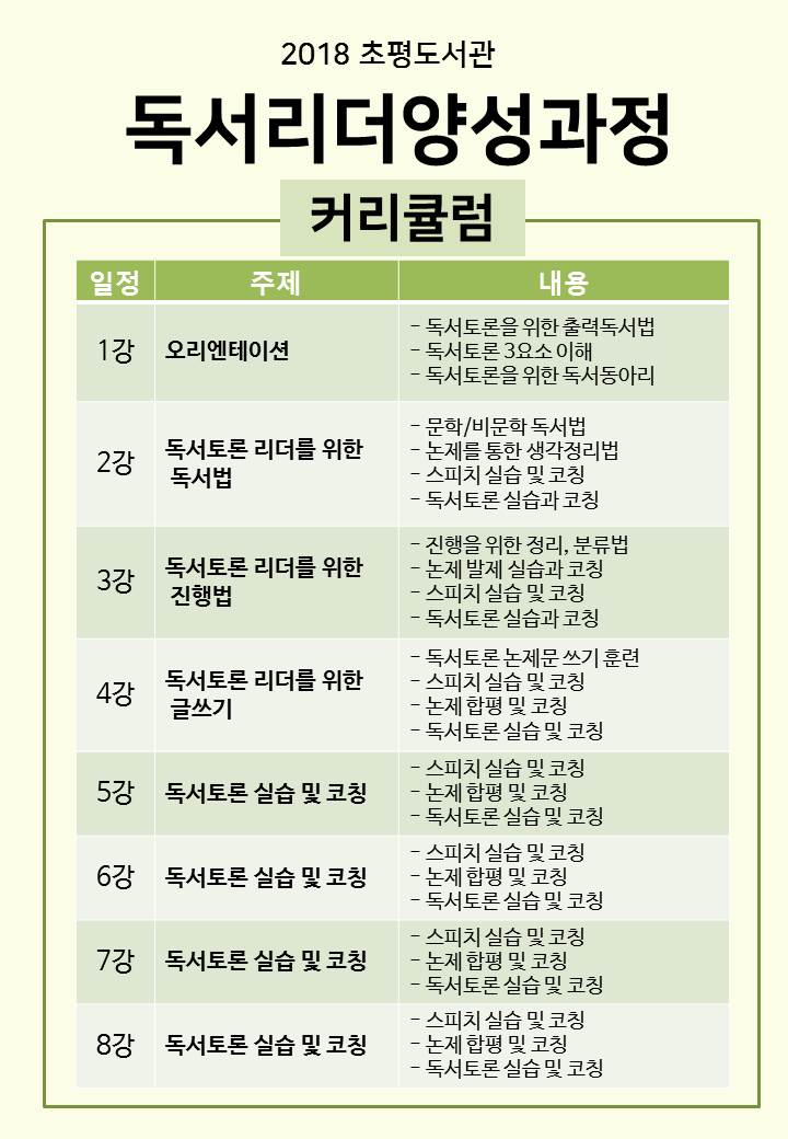 교육은 오는 9월 4일 ~ 11월 6일 매주 화요일 총8회 과정으로 실시되며, 독서동아리 운영에 대한 체계적인 커리큘럼을 통해 지역 내 독서동아리 리더를 양성하게 된다.