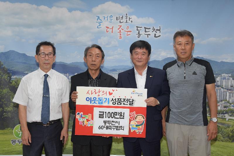 이날 동두천시청에서 열린 기탁금 전달식에는 최용덕 동두천시장, 이금로 60대 축구협회 회장, 이진섭 운영위원, 강병인 부총무와 정수동 동두천시체육회 사무국장이 참석하여 따뜻한 사랑의 손길을 전했다.