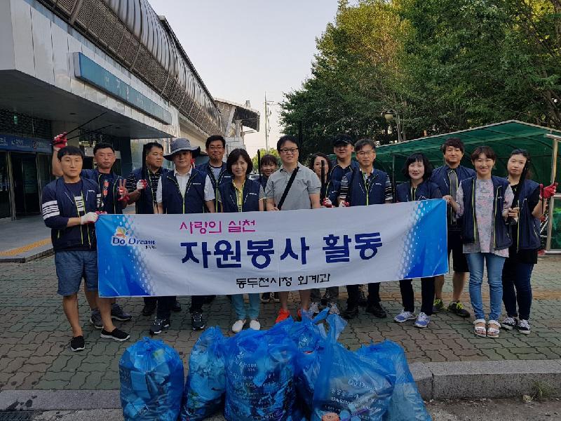 동두천시 회계과는 지난 21일 토요일 오전 7시 30분부터 지행역 뒤편 광장일대에서, 전 직원이 참여한 가운데 환경정화 자원봉사활동을 실시하였다.