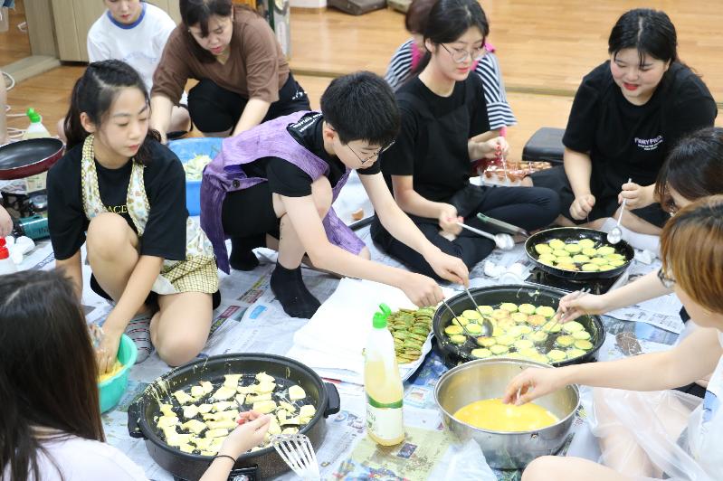 전날 시장에서 구입한 재료로 아침 일찍 음식 장만에 들어간 가족봉사단은 메뉴에 따라 아이와 엄마의 역할을 나누고, 참여자 모두 구분 없이 정겹게 이야기를 나누며 맛있는 식사를 준비하였다.