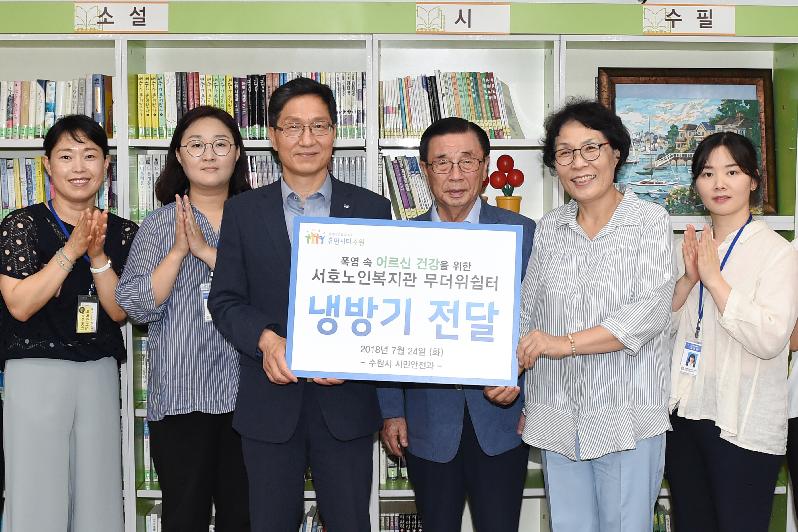 | 백운석 수원시제2부시장(왼쪽 세 번째)이 서호노인복지관 회장(오른쪽 두 번째), 서호노인복지회관 노인회장과 함께 냉방기를 전달하고 기념하고 있다. |