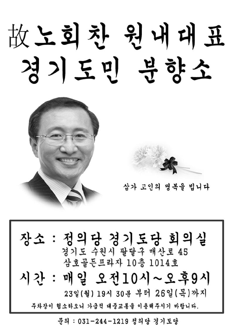 정의당 경기도당(위원장 송치용)에서는 故 노회찬 원내대표 경기도 내 고양시, 부천시, 양평군 등에 분향소를 운영하고, 26일까지 일반 시민들분들의 조문을 받는다.