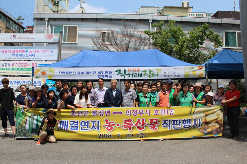 의정부시 호원1동(동장 이종태)은 지난 20일 동 주민센터 앞에서 자매결연지인 괴산군 불정면과 함께 우수한 농산물을 저렴한 가격으로 제공하는 농산물 직거래 장터를 개최했다.