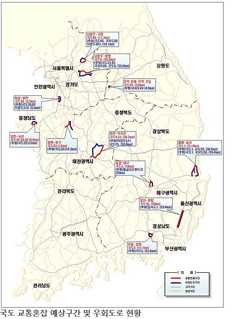 이와 함께 고속도로 23개 노선 76개 교통혼잡 예상 구간(747㎞)을 선정해 관리하고 일반국도 46호선 남양주-가평 등 교통혼잡이 예상되는 11개 구간(237.6㎞)에 대해는 우회도로가 지정·운영된다.