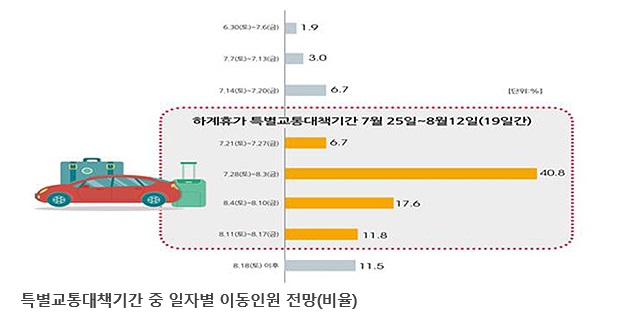 이번 대책기간 동안 올 여름휴가객의 약 64.6%가 집중된다. 특히 28일부터 내달 3일까지 7일간은 전체 중 40.8%의 이동수요가 집중돼 평시에 비해 약 47.2% 정도 이동인원이 증가할 것으로 보인다.
