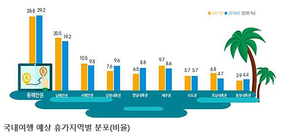 예상 국내 휴가지역으로는 동해안권(29.2%)이 가장 높게 나타났다. 남해안권(19.2%), 서해안권(9.8%), 강원내륙권(9.6%)이 그 뒤를 이었다. 해외여행 예정지역은 동남아가 26.7%로 가장 비율이 높고 일본, 중국, 동북아 순으로 전망됐다.