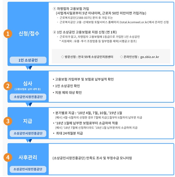 1인 영세 소상공인을 대상으로 보험료 부담을 낮춰 고용보험 가입을 활성화하고 사회안전망 사각지대 해소를 위해 기존 기준보수 1등급에 해당하는 1인 소상공인은 월 보험료(3만4650원)의 30%인 1만395원에서 50%인 1만7325원으로 지원금액이 늘어난다. 지원 대상이 아니었던 기준보수 2등급도 월 보험료(3만8920원)의 절반인 1만9460원을 새로 지원받게 된다.※ 1인 소상공인 고용보험료 지원사업