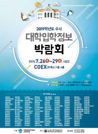 2019학년도 수시 대학입학정보박람회는 오는 26일(목)부터 29일(일)까지 4일간 삼성동 COEX(코엑스) 1층 A홀에서 개최된다. 관람 시간은 오전 10시부터 오후 5시까지이며, 입장은 16시 30분에 마감된다.