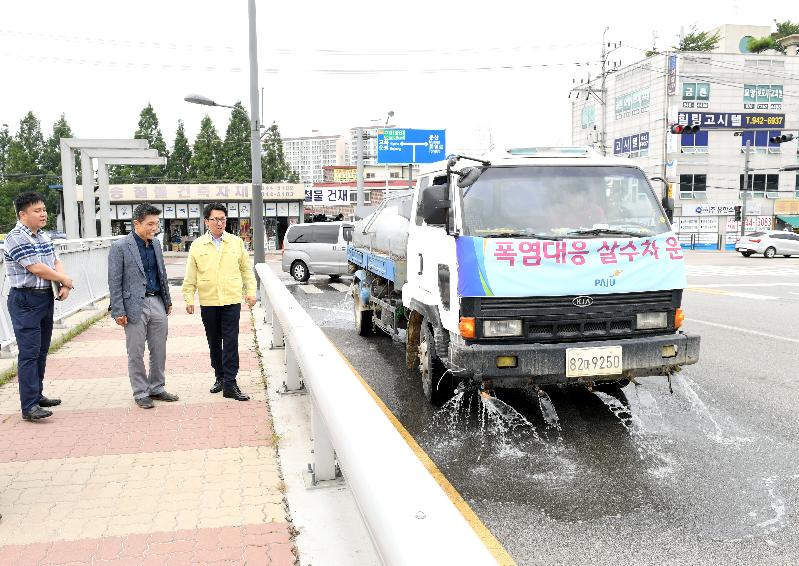 | 최종환 파주시장이 25일 오후 1시 금촌천교 위에서 살수차 운행 현장을 점검하고 있다. |