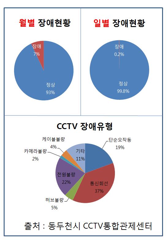 동두천시는 금년 1월부터 6월까지 6개월간 방범용CCTV 대상으로 빅데이터 분석 및 점검결과 1일 장애율이 0.2%로, 안정적으로 시스템을 유지하고 있다고 밝혔다.