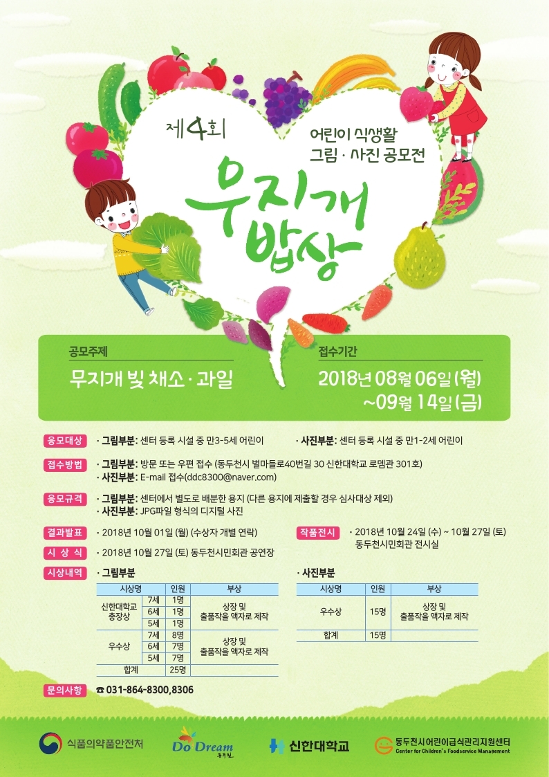 동두천시 어린이급식관리지원센터는 2018년 영양의 날(10월 14일)을 맞아, 어린이의 안전하고 건강한 식생활 실천 유도와 참여형 교육 확산을 위해, 등록된 어린이급식시설 어린이들을 대상으로 제 4회 어린이 식생활 개선 그림․사진 공모전 무지개 밥상’을 개최한다.