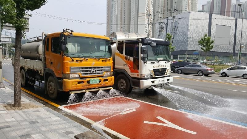 살수차는 오후 2시부터 4시까지 도로 위 먼지를 빨아들이는 노면청소차량과 함께 운행된다. 이를 통해 폭염으로 인한 도로 온도를 낮춰 열섬 현상을 방지하고 미세먼지도 함께 제거하려는 것이다.