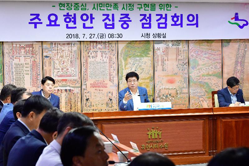 회의 참석자들은 ▲중·고등학교 교복 지원사업 ▲대형매장, 쪽방촌 안전점검 ▲폭염 장기화에 따른 시민안전 대책 수립 ▲수원컨벤션센터 개관·운영관리 종합계획 ▲수원역 성매매 집결지 정비사업 ▲수원화성 군 공항 이전·스마트폴리스 조성 등 27개 사업의 진행 상황을 보고했다.
