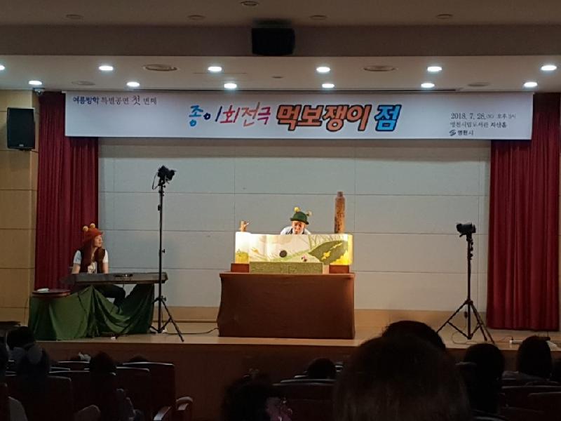 영천시(시장 최기문)가 여름방학을 맞아 28일 영천시립도서관 지산홀에서 관내 어린이들을 대상으로 ‘종이회전극 먹보쟁이 점’ 공연을 선보여 큰 호응을 얻었다.