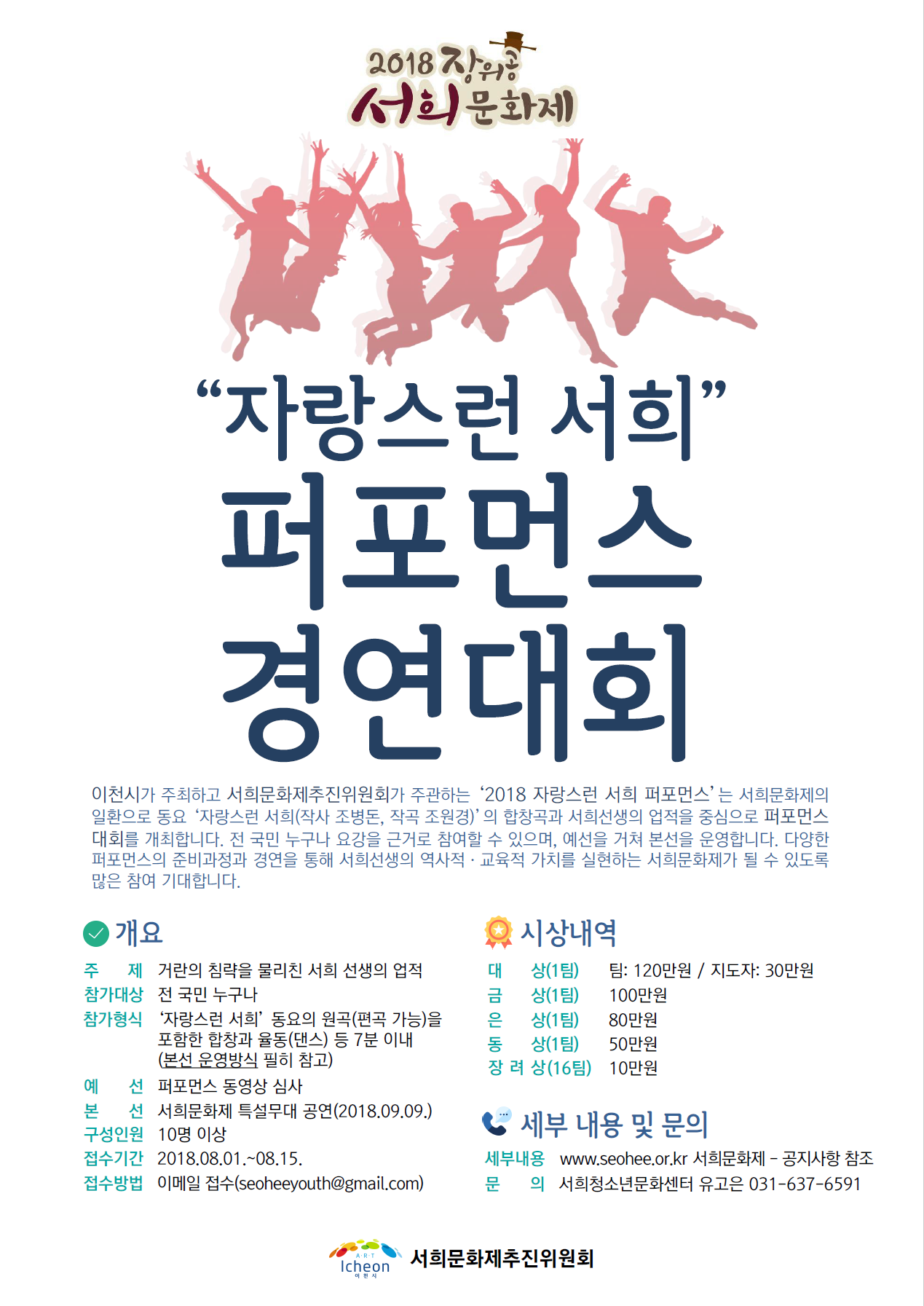 이천시((시장 엄태준)는 8월 1일부터 장위공 서희선생의 정신을 기리는 2018 장위공 서희문화제에서 끼와 열정을 맘껏 펼칠 수 있는 ‘자랑스런 서희 퍼포먼스 경연대회’참가 신청을 받는다.