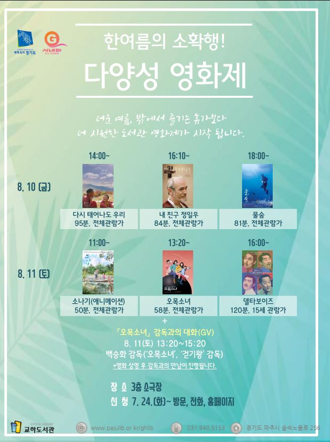파주시 교하도서관은 여름 휴가시즌을 맞아 ‘한 여름의 소확행! 다양성 영화제’를 개최해 시민들에게 질 좋고 재미있는 영화 관람 기회를 제공할 예정이다.
