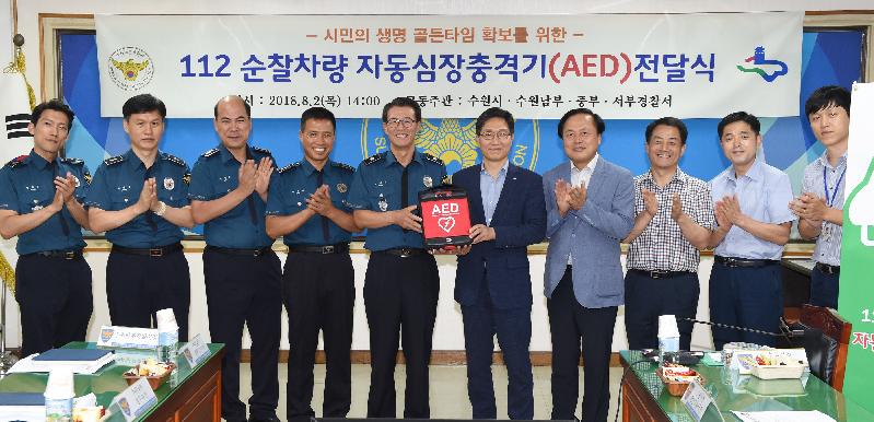 수원시가 2일 수원남부경찰서 소회의실에서 관내 112 순찰 차량에 비치할 자동심장충격기 23대를 전달했다.