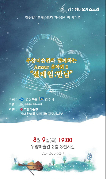 경주시(시장 주낙영)에서는 오는 9일 오후 7시 경주 우양미술관에서 경주지역 직장인 미혼남녀 100여명을 대상으로 ‘아모르(amour : 사랑) 음악회’를 개최한다.