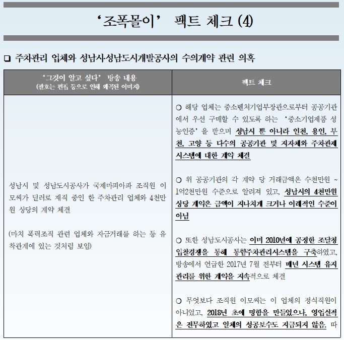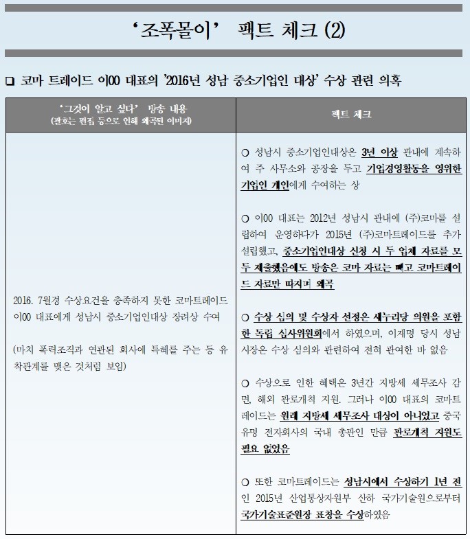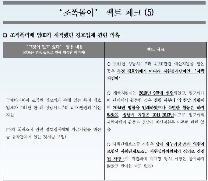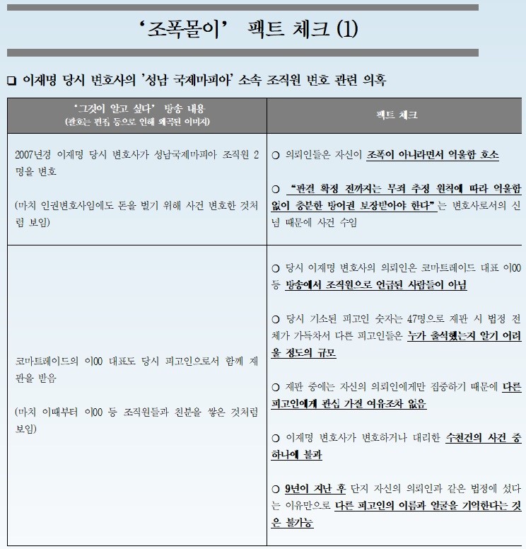 이와 함께 이재명 지사 측은 ‘조폭몰이 팩트체크’ 자료를 내고 SBS ‘그것이 알고 싶다’의 방송 내용 중 사실과 다른 부분을 5개의 쟁점 분야로 나눠 조목조목 되짚었다.