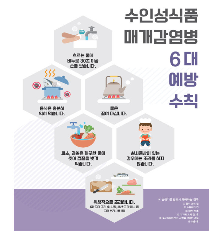 여름철은 비브리오패혈증, 캄필로박터, 살모넬라, 병원성대장균 등의 병원균 증식의 적합한 환경으로 이러한 균에 오염된 음식을 섭취할 때 감염병 발생위험이 높아지게 된다.