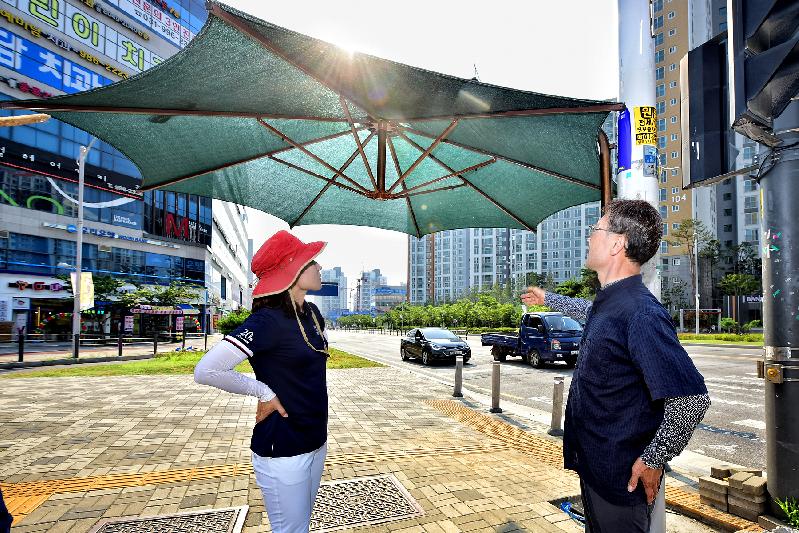 | 정하영 시장과 신명순 의장이 구래동에 2일 설치된 그늘막을 점검하고 있다. |