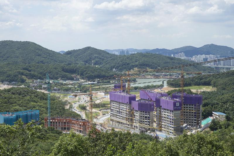 의왕 바라산자연휴양림 전망대에서는 백운호수와 함께 시원하게 트인 경관을 엿볼 수 있다. 특히, 호수 앞쪽에는 올해 말 준공을 앞두고 있는 백운밸리 공사현장의 모습이 눈에 띈다.