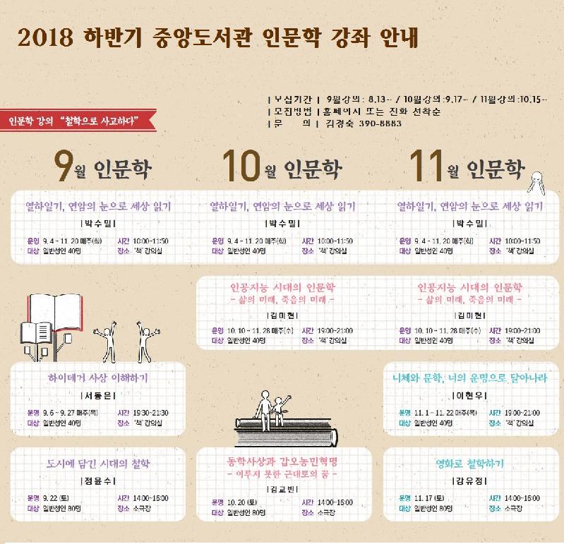 중앙도서관은 인문학 특화도서관으로 그동안 생활 속 다양한 주제를 소재로 인문학의 대중화에 힘써 왔으며, 하반기에는 인문학적 사고력을 향상시키기 위해 보다 깊이 있는 내용으로 준비했다.