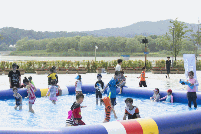 의왕 왕송호수 여름축제가 열리고 있는 왕송호수 레일바이크 광장에서 아이들이 신나게 물놀이를 즐기고 있다.