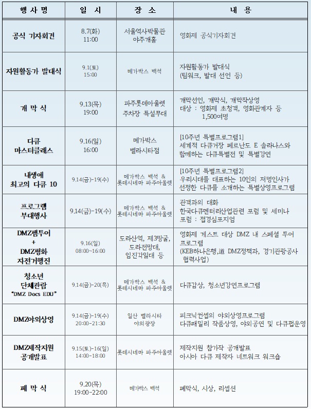 10주년을 맞는 올해 DMZ국제다큐영화제에는 8일 동안 39개국에서 참가한 142편의 다큐멘터리 영화가 경쟁과 비경쟁부문으로 나뉘어 상영된다. 이는 지난해 상영된 42개국 112편보다 30편이 늘어난 규모다.