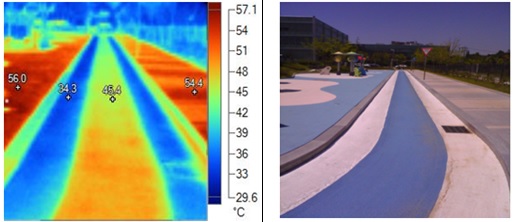 시흥에코센터에서 아이들에게 인기 있는 야외 전기자동차체험장(A=739㎡)에 쿨페이브먼트를 시공한 결과, 야외온도 35℃의 무더위에서 지표면 보도블록 온도가 54℃일 때 특수 도료가 시공된 지점의 지표면 온도는 34℃ ~ 45℃로 최대 20℃의 지표면 온도 저감 효과가 있는 것으로 확인되었다.