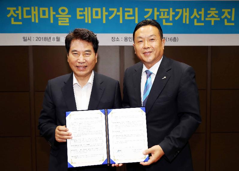 용인시는 지난 7일 시청 파트너스룸에서 백군기 시장과 전대마을 건물주와 점포주‧단체장 등 8명으로 구성된 간판개선주민위원회 위원들이 참석한 가운데 새로운 ‘전대마을 테마거리 간판개선 추진 협약’을 체결했다.