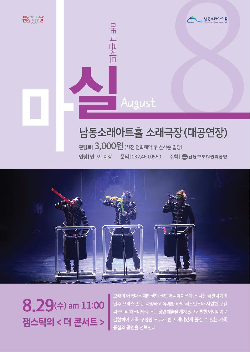 마티네콘서트 마실-잼스틱의 8월 29일(수) 오전 11시에 대공연장(소래극장)에서 공연되며, 관람료는 전석 3천원, 사전 전화예약(032-460-0560) 후 선착순 입장이다.
