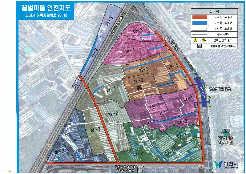 과천시는 대규모 거주용 비닐하우스 지역인 꿀벌마을의 화재피해 최소화를 위한 안전지도 및 안내표지판을 제작하여, 김종천 과천시장, 김경호 과천소방서장, 김금순 주민자치회장 등이 참석한 가운데 9일 꿀벌마을 주민자치회관에서 안내표지판 부착식을 개최한다고 밝혔다.