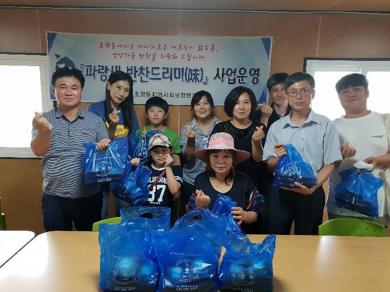 초평동지역사회보장협의체 위원들은 2016년부터 매월 2회 14가구를 대상으로 가정방문을 통해 『파랑새 반찬드리미(味)』특화사업을 운영하고 있고, 단순 반찬 배달에 그치지 않고 어르신들의 안부를 물으며 소통하는 시간을 갖고 있다.