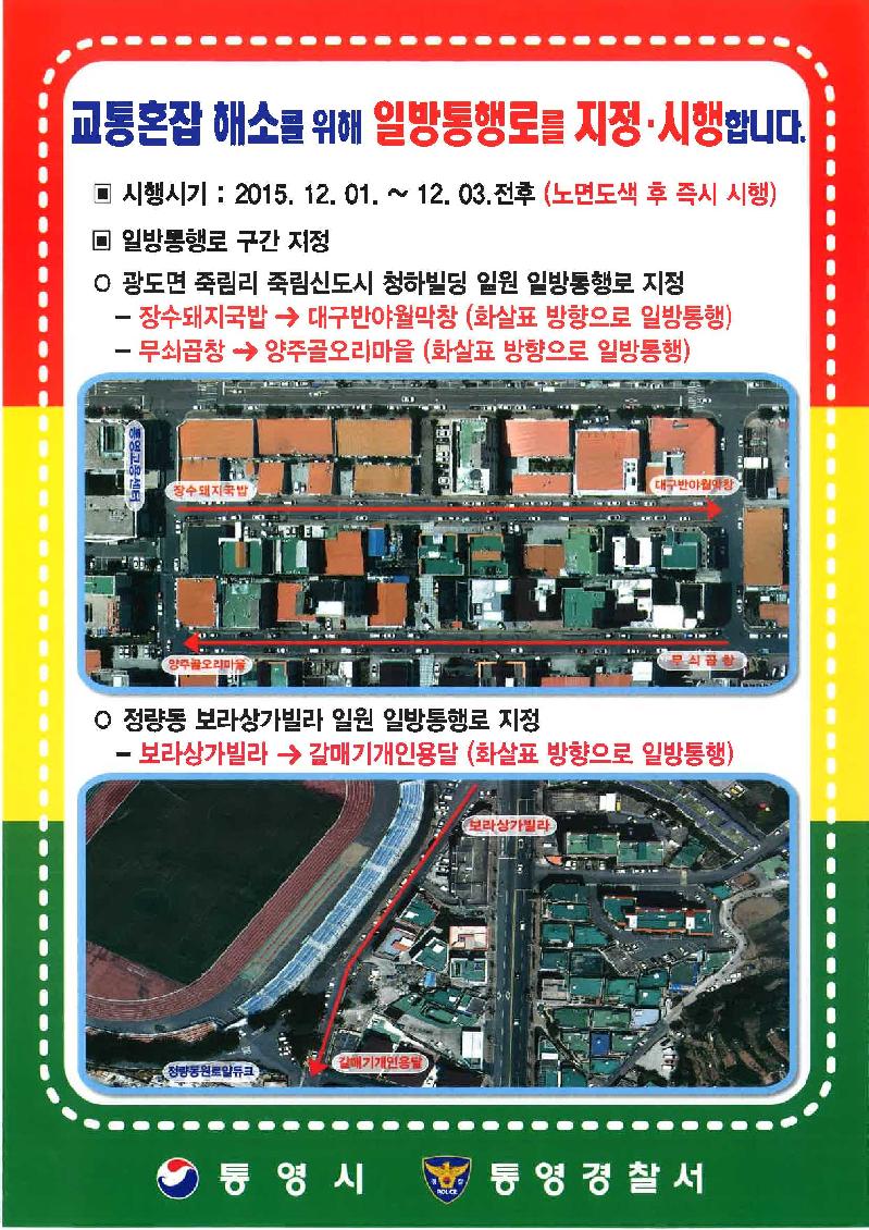 통영시 (시장 김동진)는 12월 4일(금)부터 광도면 죽림신도시 청하빌딩 일원과 정량동 보라상가빌라 일원을 일방통행로로 지정 운영한다.