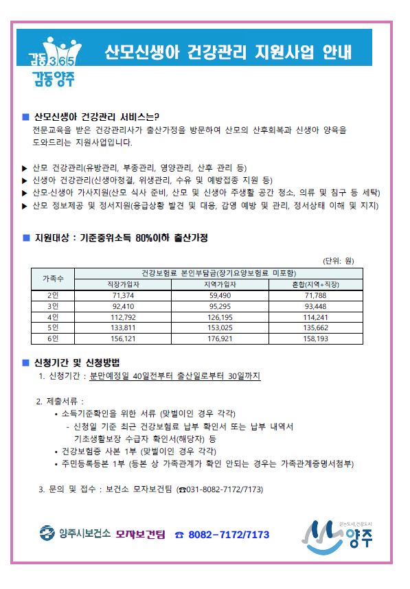 양주시(시장 이성호)는 산모와 신생아의 건강관리를 위한 ‘산모신생아 건강관리 지원사업’을 실시한다고 14일 밝혔다.