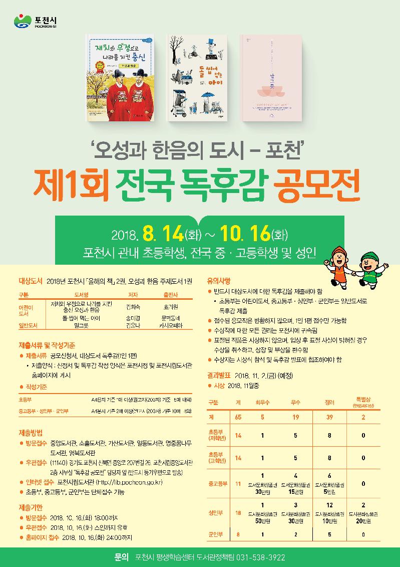 독후감 대상도서는 2018년 포천시 올해의 책인 ‘돌 씹어 먹는 아이’(송미경 저, 문학동네),‘말그릇’ (김윤나 저, 카시오페아)과 오성과 한음 관련도서인‘재치와