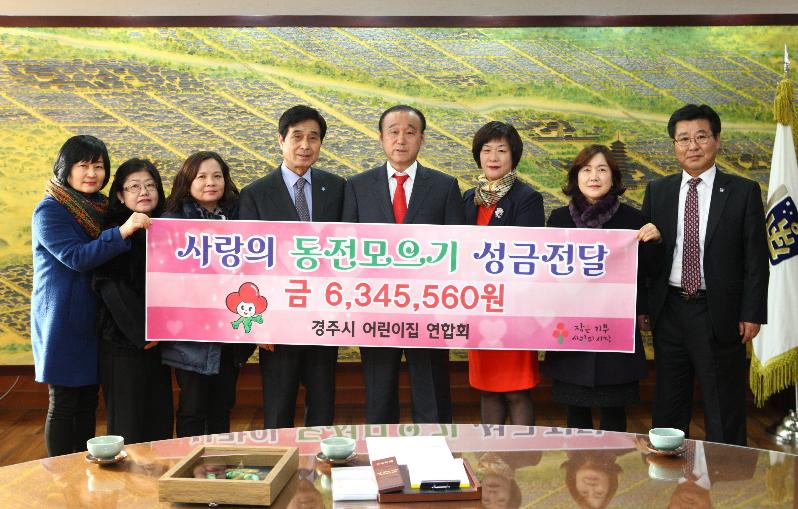 경주시어린이집연합회(회장 김영섭)는 4일 시청을 방문하여 ‘희망 2016 나눔 캠페인’에 630만원의 성금을 기탁했다. 지난달 23일부터 전 시민들이 함께 참여하는 희망 나눔 캠페인에 어린이집연합회에서도 뜻을 모아 사랑의 온도탑의 온기를 더했다. 이번 캠페인은 연합회 소속 어린이집에서 원생들이 자발적 기부참여로 이루어졌으며 모여진 성금은 경주시 독거노인, 청소년, 소년소녀가장 등 도움이 필요한 소외계층을 위해 쓰일 예정이다. 김영섭회장은 “고사리 같은 어린이들이 이웃사랑 캠페인에 적극 동참해 주어 고맙다며, 많은 액수는 아니지만 어려운 이웃에게 희망의 씨앗이 되길 바라며 앞으로도 꾸준히 나눔 문화 확산에 동참 하겠다.”고 말했다. 최양식 경주시장은 “지역의 보육과 양육을 위해 헌신하고 있는 어린이집연합회에서 사랑과 희망의 메시지를 보내준데 대해 감사를 전하며, 사랑의 온도탑이 쑥쑥 올라갈 수 있도록 많은 성원과 관심을 당부” 했다.