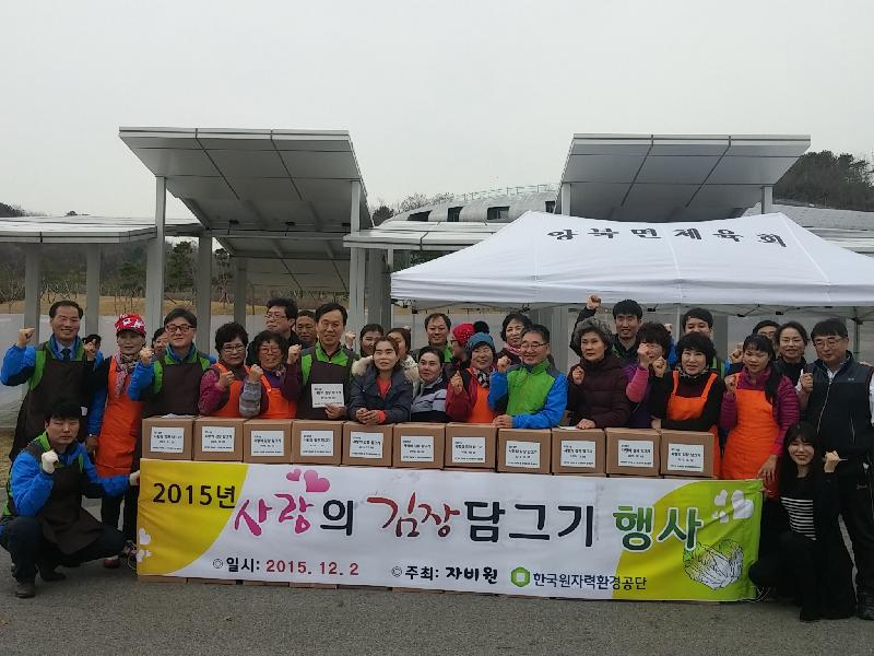 한국원자력환경공단과 양북면 자비원(원장 박삼희)에서는 지난2일 사랑의 김장 담그기 행사를 통해 온정이 가득한 김장 김치 1,000포기(150박스)를 저소득 다문화 가정, 독거노인 등 어려운 이웃 150세대에 전달했다.이날 행사에는 원자력환경공단 및 자비원 회원, 지역 주민 등 추운날씨에도 많은 사람들이 참여해 나눔 활동을 펼쳤다. 박삼희 자비원 원장은 “많은 봉사자들의 정과 사랑이 듬뿍 담긴 김장김치가 소중한 이웃에 전달되어 모두가 따뜻한 연말을 보낼 수 있기를 바란다.”고 말했다.