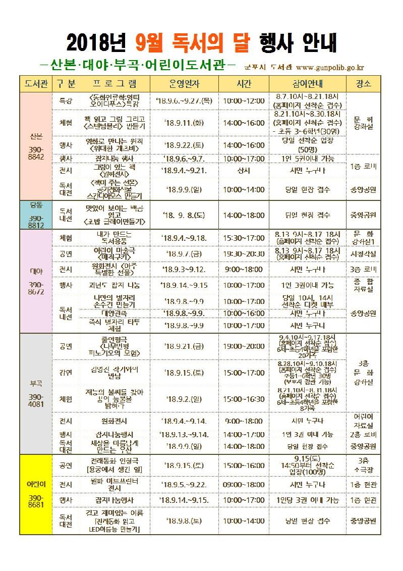 9월 독서의 달 행사와 관련한 자세한 사항은 산본도서관(☎031-390-8842), 당동도서관(☎031-390-8812), 대야도서관(☎031-390-8672), 부곡도서관(☎031-390-4081), 어린이도서관(☎031-390-8681)으로 문의하면 된다.