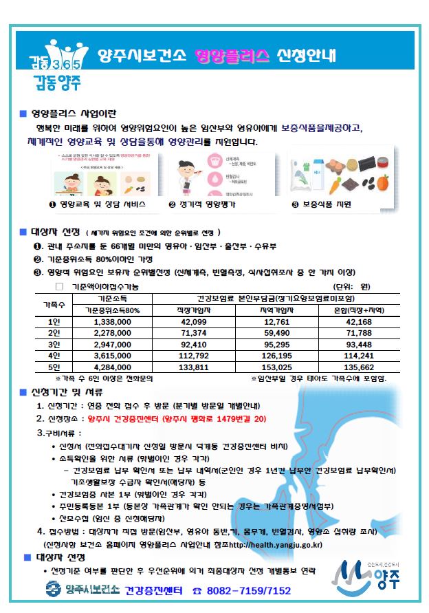 기타 궁금한 사항은 양주시 보건소 홈페이지(http://health.yangju.go.kr) 영양플러스 사업안내를 참고하거나 전화로 문의하면 안내받을 수 있다.