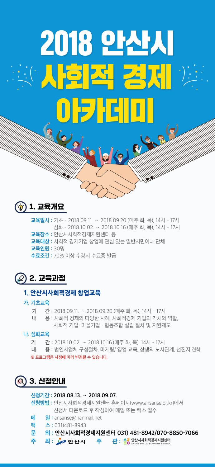 안산시(시장 윤화섭)는 오는 9월부터 2018년 안산시 사회적경제 아카데미교육을 진행한다고 밝혔다.