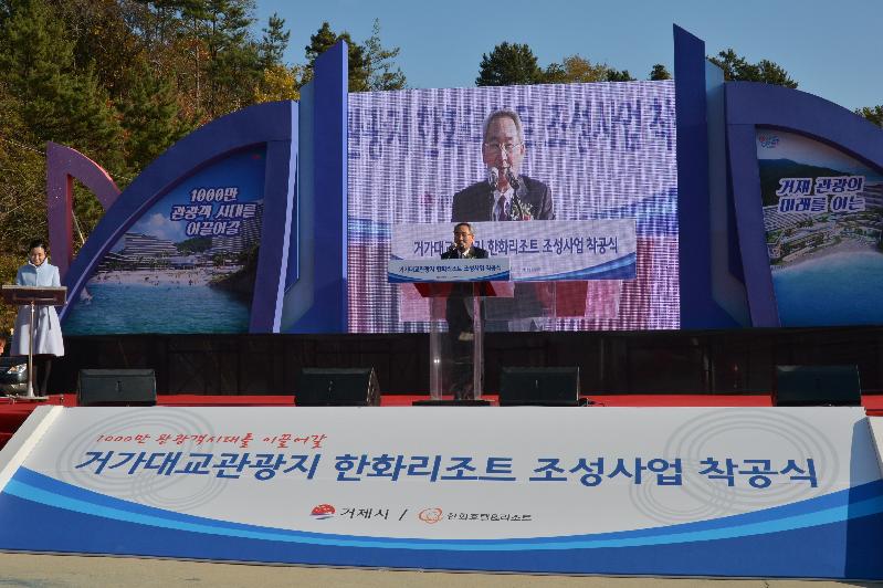 권민호 거제시장은 착공식이 개최되기까지 지역주민의 단결된 의지와 응원 덕분에 가능한 일로 감사인사를 전하며, 심혈을 기울인 그동안의 노력과 고민의 날들 회상으로 감정이 북받치듯 앞으로 거제 북부권의 한화리조트 조성으로 우리시는 세계적인 관광휴양도시로의 도약과 1,000만 관광객 시대를 열어 갈 것으로, 그 희망찬 미래에 거제시민 모두가 함께하시길 바란다며 힘주어 말했다.