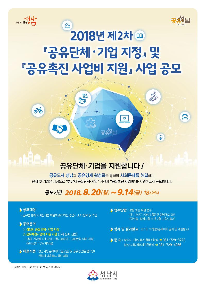 또한, 공유 기업·단체로 지정되면 성남시 관계 부서와 공유촉진 사업 협업을 행정적으로 지원하며, 3년간 ‘공유 성남 BI(Brand Identity)’ 사용권을 준다.