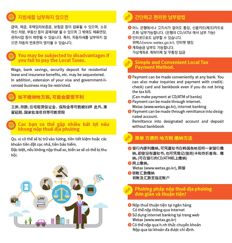 다문화가족 및 외국인들이 지방세 정보 부족으로 겪는 체납 발생을 예방하고, 외국인 납세자 편의를 위해 제작했다.