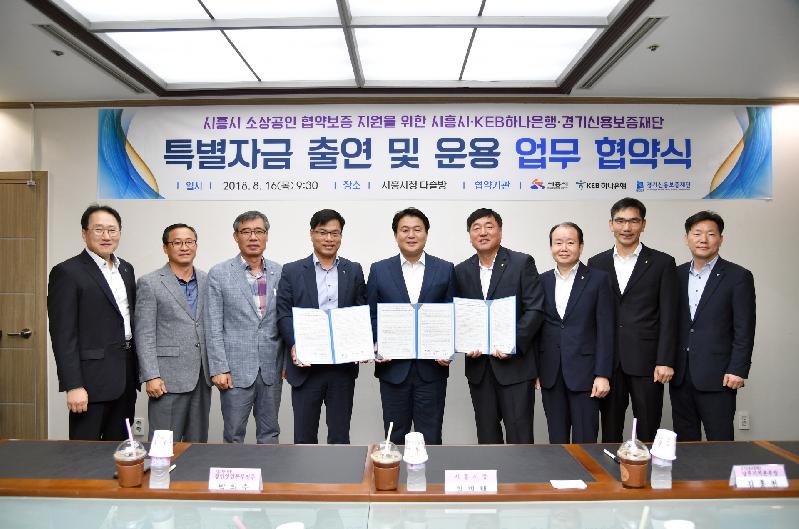 시흥시(시장 임병택)와 KEB하나은행(경인영업본부전무 박의수), 경기신용보증재단(남부지역본부장 김홍천)은 지난16일 시흥시청 다슬방에서 3개 기관 대표자가 참석한 가운데 ‘시흥시 소상공인 협약보증 지원을 위한 시흥시· KEB하나은행·경기신용보증재단 특별자금 출연 및 운용 업무 협약식’을 체결했다.